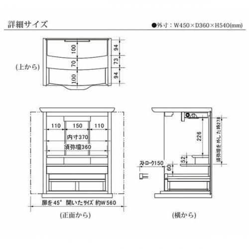 コンパクトタイプ仏壇 ミモザ540 ワイド ミモザはマメ科アカシア属の植物の総称で、イギリスで切り花として売られていたフサアカシアをmimosa と呼んだことが由来です。 しかし本来、mimosaはオジギソウの総称でしたが姿が似ているため混同され、今ではフサアカシアの総称になっています。 シンプルなデザインの中に、それぞれの素材を活かして身近な空間に調和する仏壇をコンセプトとしています。 天然木ウォールナット材は強度と粘りがあり、加工がしやすい材。 紫を帯びた灰色をしていて、落ち着いた色の塗装が合います。 高級家具材、工芸材、楽器、内装材などに使われています。 最近では良い材料が手に入りにくく、希少価値が高まっています。 毎日のお祀りで道具の出し入れがしやすい便利なスライド式須弥壇です。 扉の吊り元にマグネットヒンジを採用。 金属部分が見えない美しいデザインであるだけでなく、付属の専用工具を 使うと簡単に扉が外せるメンテナンスがしやすい構造です。 小物を入れる引き出し付き。 須弥壇(上段のみ)は取り外し可能です。 和室の地袋に合わせやすいサイズです。 ※掲載写真中の仏壇内に置かれた仏具などは別売です。 ※天然木を使用しておりますので、節や木目など1つ1つ異なります。 木目が気に入らないなどの理由での交換、返品は承れません事をご了承ください。 ※ご利用のモニターによって、商品の色味や素材感などが、実物と微妙に異なる場合がございます。ご了承ください。 ●外寸:W450×D360×H540(mm)|膳引き有効面:W338×D246(mm)|引出し内寸:W310×D225×H45(mm) ●詳細 ・材質:天然木ウォールナット材 ・塗装:ウレタン塗装 ・重量:約18kg ・須弥壇取り外し可(上段のみ) ・スライド式 膳引き ・引出付 ・LEDライト付 ・ベトナム製 ●梱包数:1/完成品 | |||